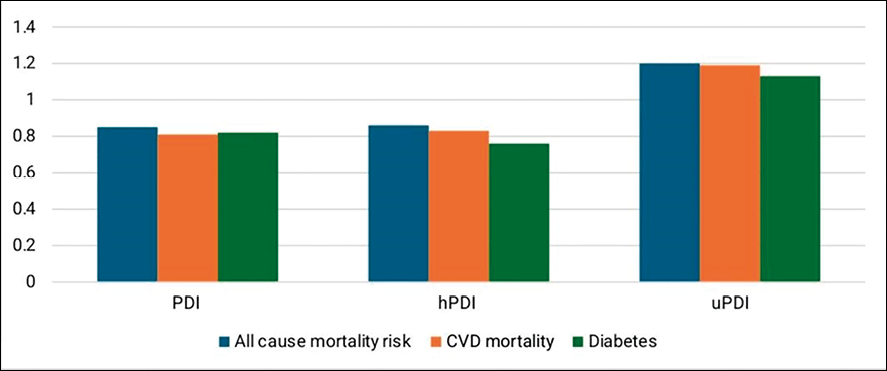 In a study determining the risk off all case mortality & CVD in case of uPDI, hPDI & PDI, uPDI were associated with higher RR (>1) indicating a higher risk of all case mortality & CVD in comparison to PDI & uPDI [1]. The same results were observed in case of Diabetes [2].